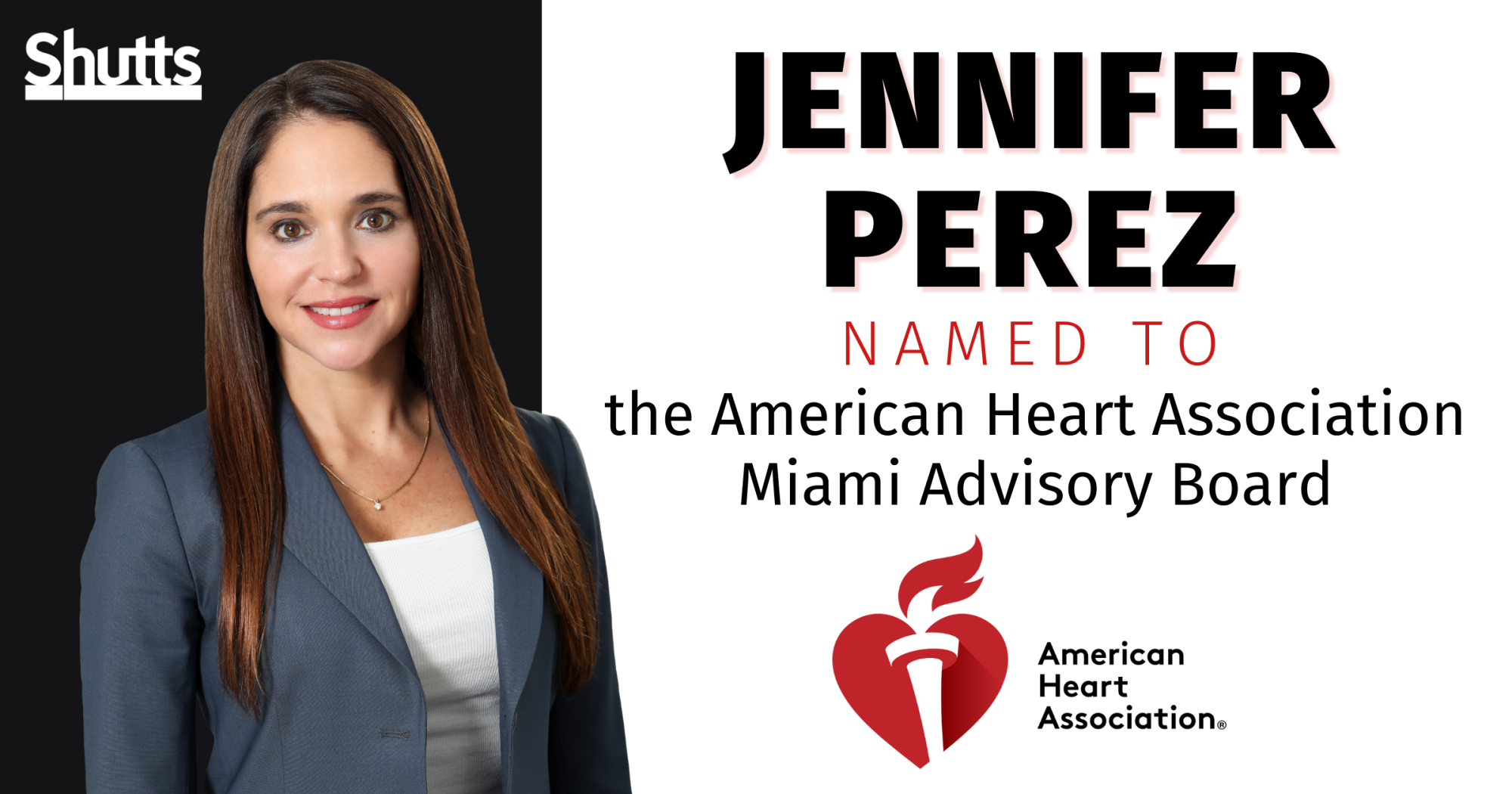 Shutts & Bowen LLP Miami partner Jennifer Perez was recently named to the American Heart Association Miami Advisory Board.