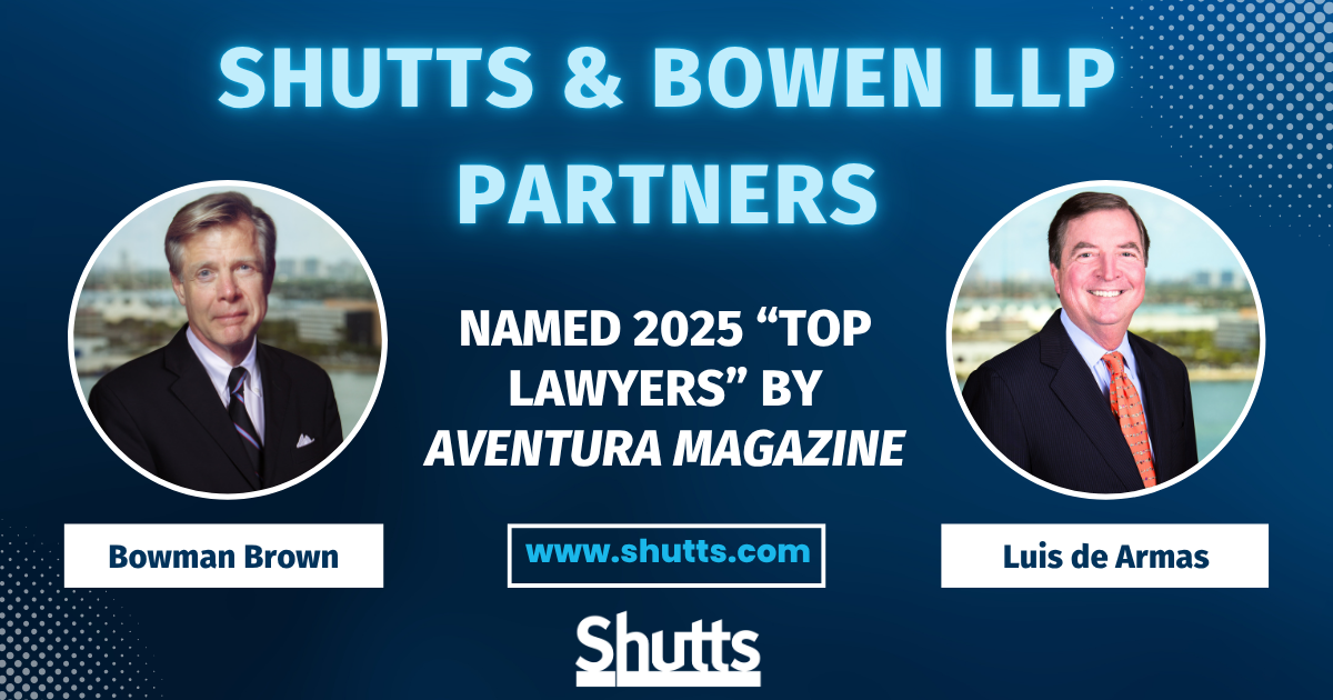 Shutts & Bowen LLP is pleased to announce partners Bowman Brown (Banking and Finance Law) and Luis de Armas (Corporate Law) have been named 2025 Top Lawyers in Aventura Magazine’s October edition.