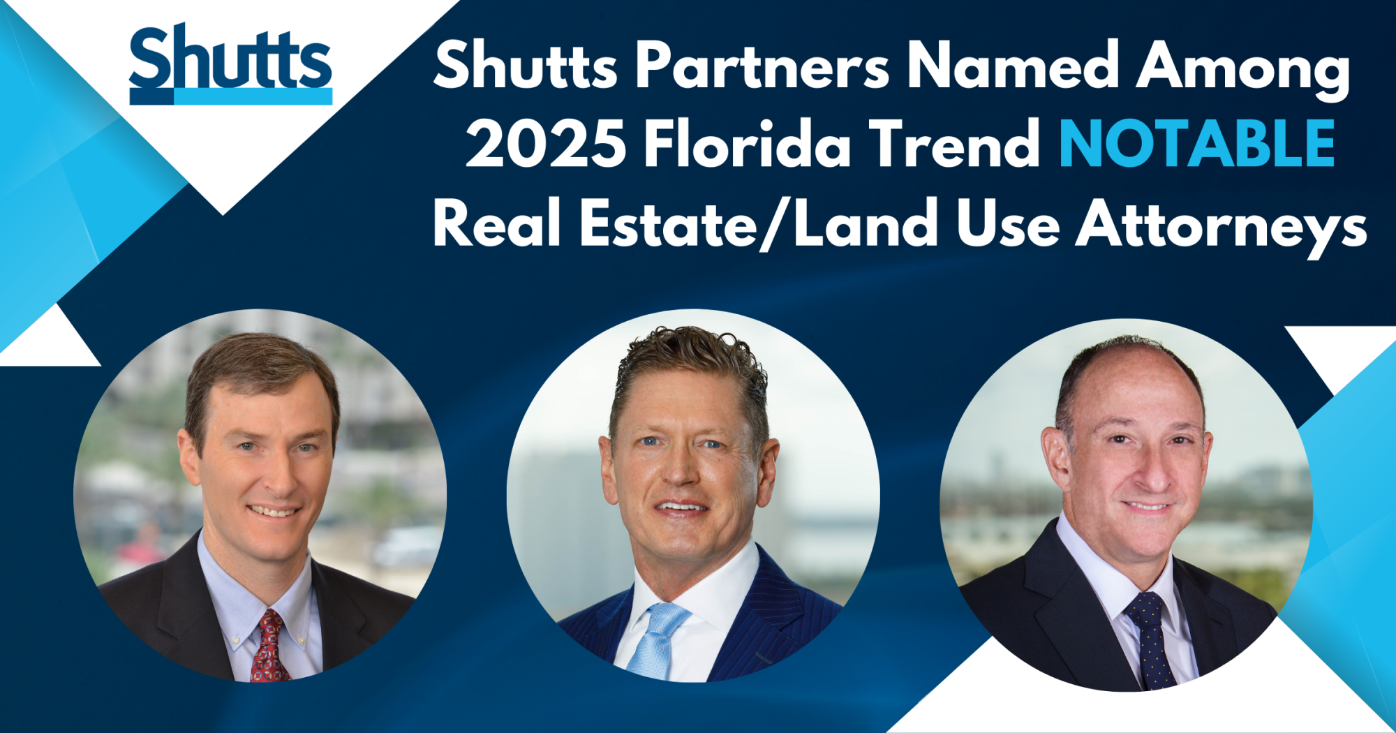 Shutts & Bowen LLP is pleased to announce that Charles B. “Chuck” Costar, III, Harvey E. Oyer III, and Alexander I. Tachmes were recently recognized by Florida Trend as honorees in the 2025 Legal Elite NOTABLE Real Estate/Land Use Attorneys profile.
