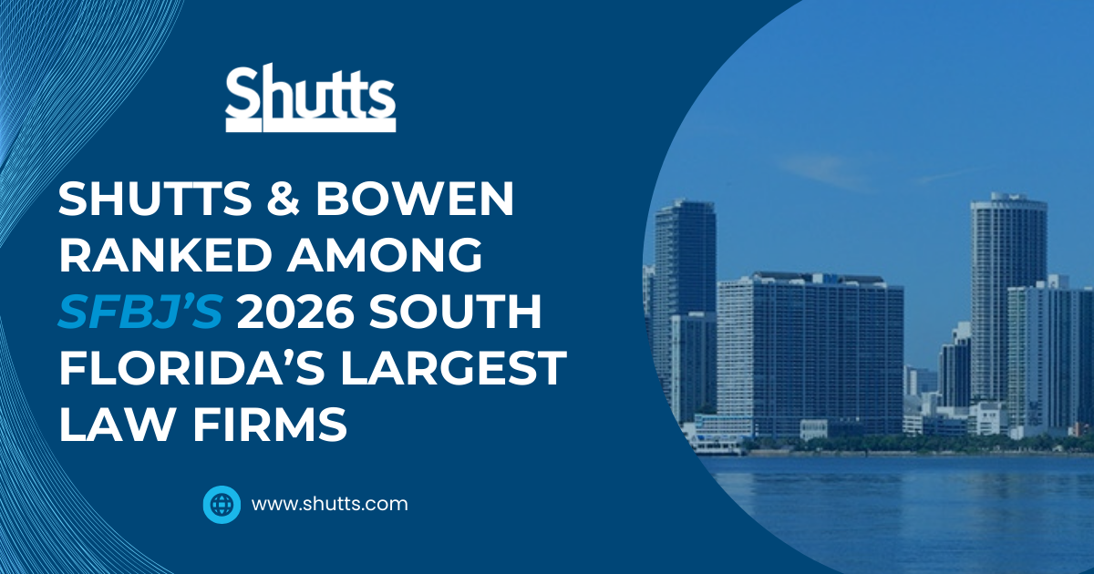 Shutts & Bowen LLP was recently recognized by the South Florida Business Journal on its 2026 “South Florida’s Largest Law Firms” list, ranking No. 6 among 144 firms based on the total number of attorneys practicing in the South Florida market.